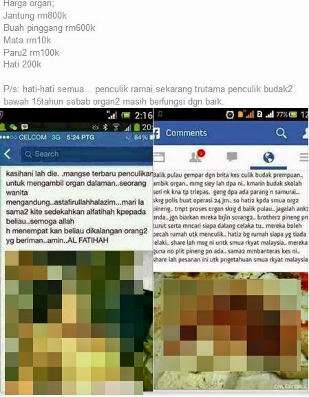 BERITA PALSU : ORGAN JANTUNG DI JUAL RM 800K | Sejak kebelakangan ini, berita mengenai jenayah jual organ kanak-kanak semakin giat disebarkan dilaman sosial.